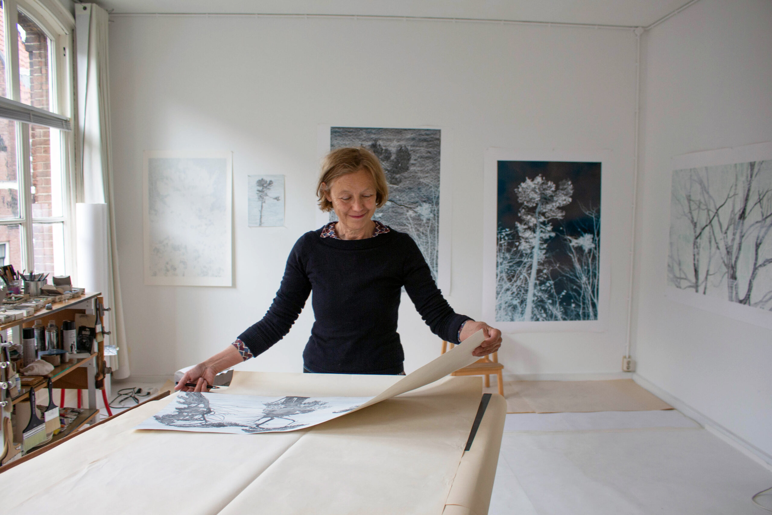 Sandra Kruisbrink (1961, NL) is a visual artist from the Netherlands, her main focus is drawing but she often integrates printmaking and photography in her drawings. Her works on paper appear light and open, yet they are highly complex and the product of an extremely labour-intensive process. She works precisely, drawing the finest of lines, and her interest in craftsmanship is evident. Her inspiration is drawn from nature; mountains and trees are predominant in her recent work.